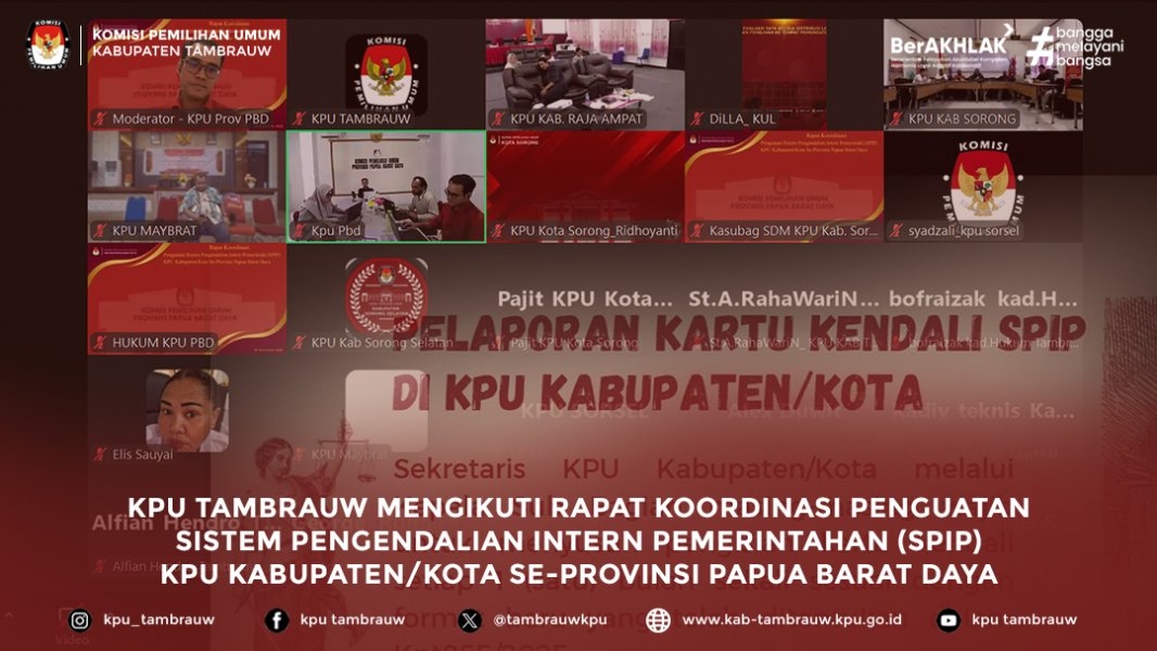 #TemanPemilih, KPU Kabupaten Tambrauw mengikuti Rapat Koordinasi Penguatan Sistem Pengendalian Intern Pemerintah (SPIP) yang diselenggarakan oleh KPU Provinsi Papua Barat Daya. Dalam rapat tersebut, selain dijelaskan mengenai pembentukan Satuan Tugas (Satgas) SPIP, juga dibahas terkait indikator kinerja kegiatan yang penilaiannya dilaksanakan melalui mekanisme Penilaian Mandiri (Self Assessment). Kegiatan ini diharapkan dapat memperkuat akuntabilitas dan transparansi kinerja, serta mendukung terwujudnya KPU Kabupaten Tambrauw yang berintegritas, profesional, dan terpercaya dalam setiap tahapan penyelenggaraan pemilu.