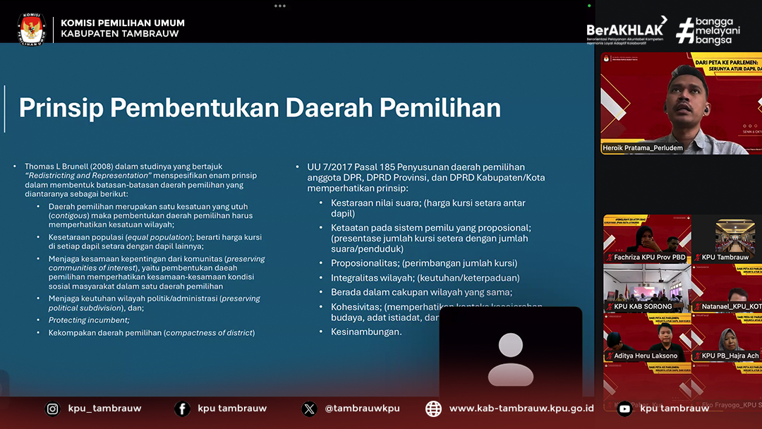 Kegiatan yang diselenggarakan oleh KPU Provinsi Papua Barat Daya ini menghadirkan narasumber Bapak Heroik M. Pratama, selaku Direktur Perludem. Dalam pemaparannya, beliau memberikan penjelasan mendalam terkait proses penataan dapil dan penghitungan alokasi kursi, khususnya di wilayah Kabupaten Tambrauw. Berdasarkan data jumlah penduduk yang mencapai sekitar 32.070 jiwa, apabila dibagi dengan Bilangan Pembagi Pemilih (BPP) sebesar 18.184, diperoleh hasil 1,76 kursi. Dengan demikian, Kabupaten Tambrauw mendapatkan alokasi 2 kursi DPRD Kabupaten, yang kemudian digabung dengan Kabupaten Maybrat, yang memiliki alokasi 3 kursi, sehingga membentuk satu daerah pemilihan (dapil) gabungan.
