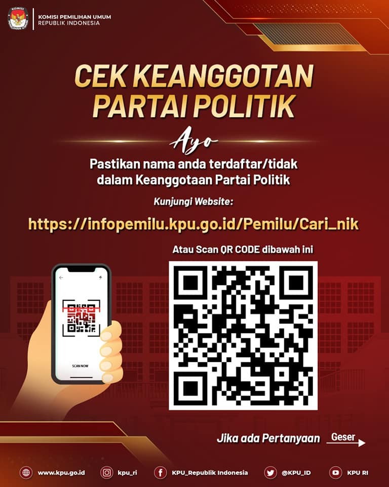 #TemanPemilih, kamu perlu tahu, kamu bisa cek lho apakah namamu terdaftar atau tidak dalam keanggotaan partai politik, di laman infopemilu.go.id. (atau langsung scan barcode di slide pertama)