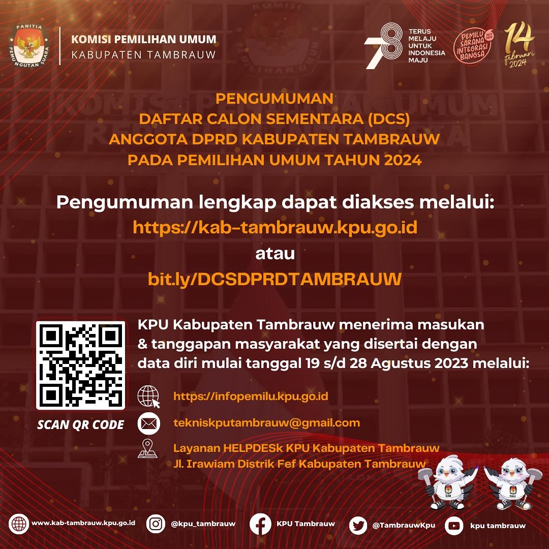 #TemanPemilih, KPU Kabupaten Tambrauw mengumumkan Daftar Calon Sementara (DCS) Anggota DPRD Kabupaten Tambrauw dalam Pemilu Tahun 2024.