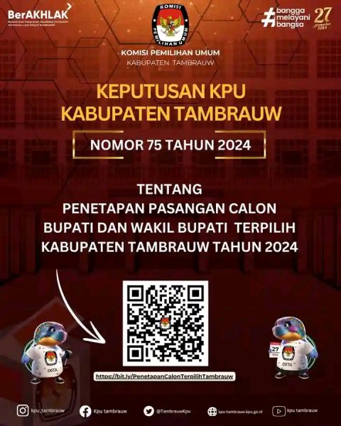 #temanpemilih berikut Pengumuman SK KPU Kabupaten Tambrauw Nomor 75 Tahun 2025 tentang Penetapan Pasangan Calon Bupati dan Wakil Bupati Terpilih Kabupaten Tambrauw Tahun 2024.
