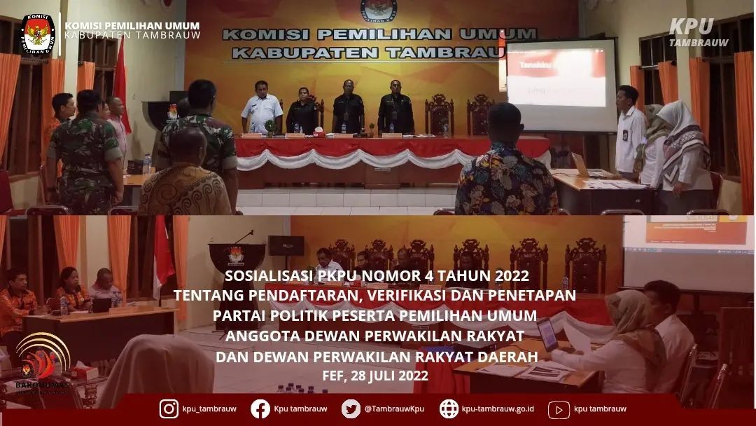 #temanpemilih pada Kamis, 28 Juli 2022 bertempat di aula kantor KPU Kabupaten Tambrauw telah dilaksanakan Sosialisasi Peraturan Komisi Pemilihan Umum Nomor 4 Tahun 2022 Tentang Pendaftaran, Verifikasi dan Penetapan Partai Politik Peserta Pemilihan Umum Anggota Dewan Perwakilan Rakyat dan Dewan Perwakilan Rakyat Daerah.
