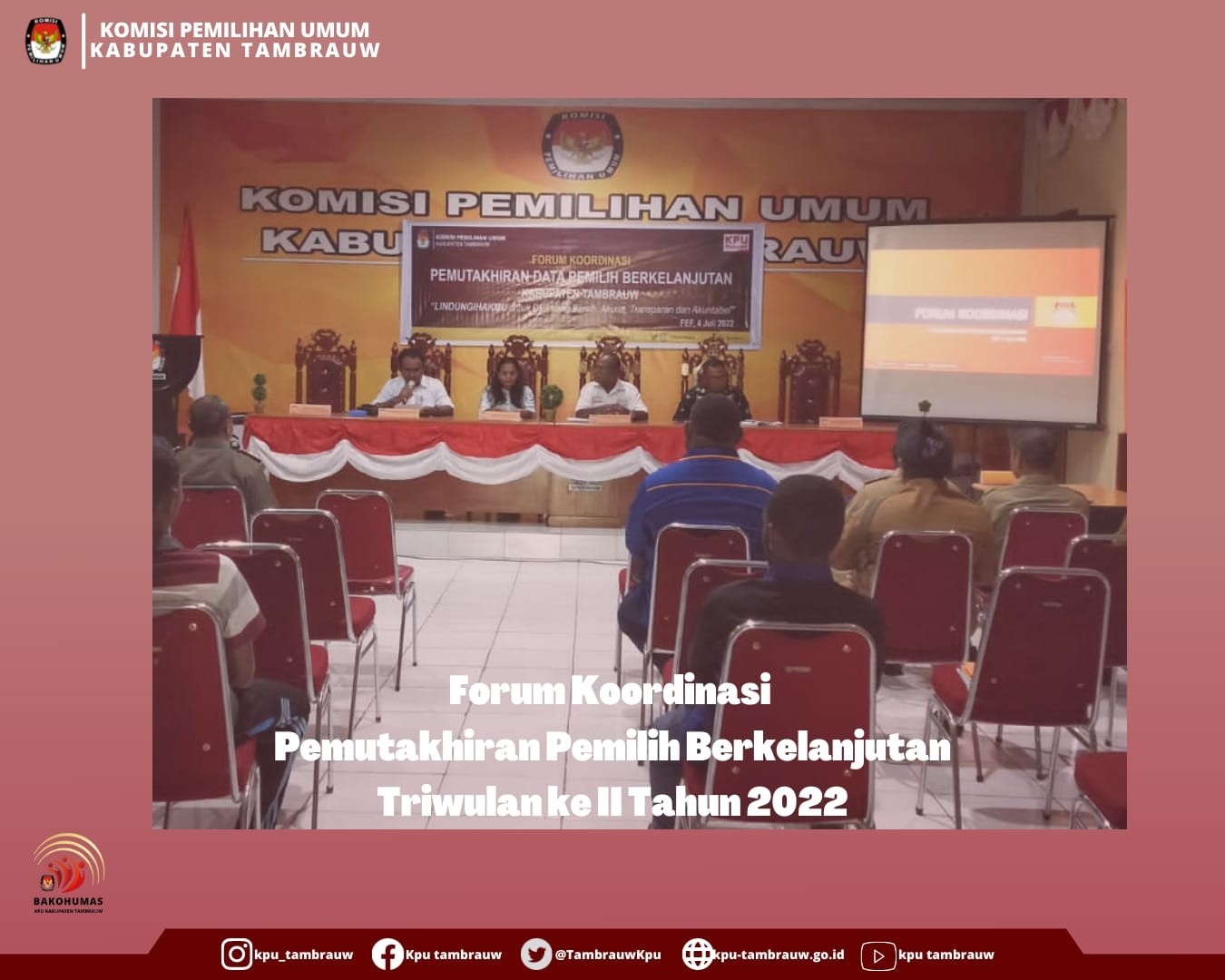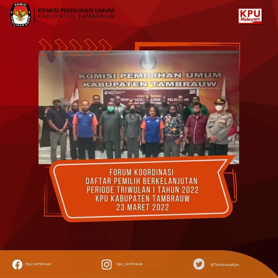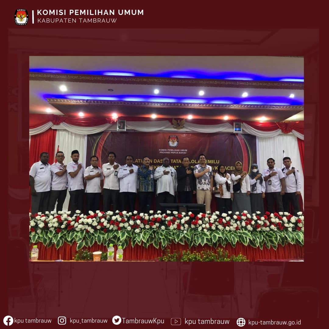 #TemanPemilih Pada Senin, 20 Juni 2022 Pegawai Sekretariat KPU Kabupaten Tambrauw sebanyak 11 orang telah mengikuti Pelatihan Dasar Tata Kelola Pemilu di Lingkungan Sekretariat KPU Provinsi/KIP Aceh dan Sekretariat KPU/KIP Kabupaten/ Kota yang diselenggarakan oleh Puslitbang KPU RI bertempat di hotel Oriestom Manokwari. Kegiatan tersebut dibuka secara resmi oleh Idham Kholik Anggota KPU RI didampingi oleh Kapuslitbang Lucky Fernandy Majanto, juga dihadiri oleh Ketua dan Sekretaris KPU Provinsi Papua Barat.Dalam kesempatan ini beliau menyampaikan bahwa dengan adanya Pelatihan Dasar Tata Kelola Pemilu ini diharapkan dapat meningkatkan kualitas serta kapasitas, integritas dan kompetensi pegawai di Lingkungan Sekretariat KPU. Materi yang disampaikan adalah dasar pemilu dan demokrasi, dan kesekretariatan penyelenggara pemilu yang independen dan berintegritas. Pada sesi terakhir diadakan post test untuk mengukur pemahaman peserta atas materi yang telah disampaikan oleh fasilitator dari tenaga ahli KPU RI #KPUMelayani #PemiluSerentak2024