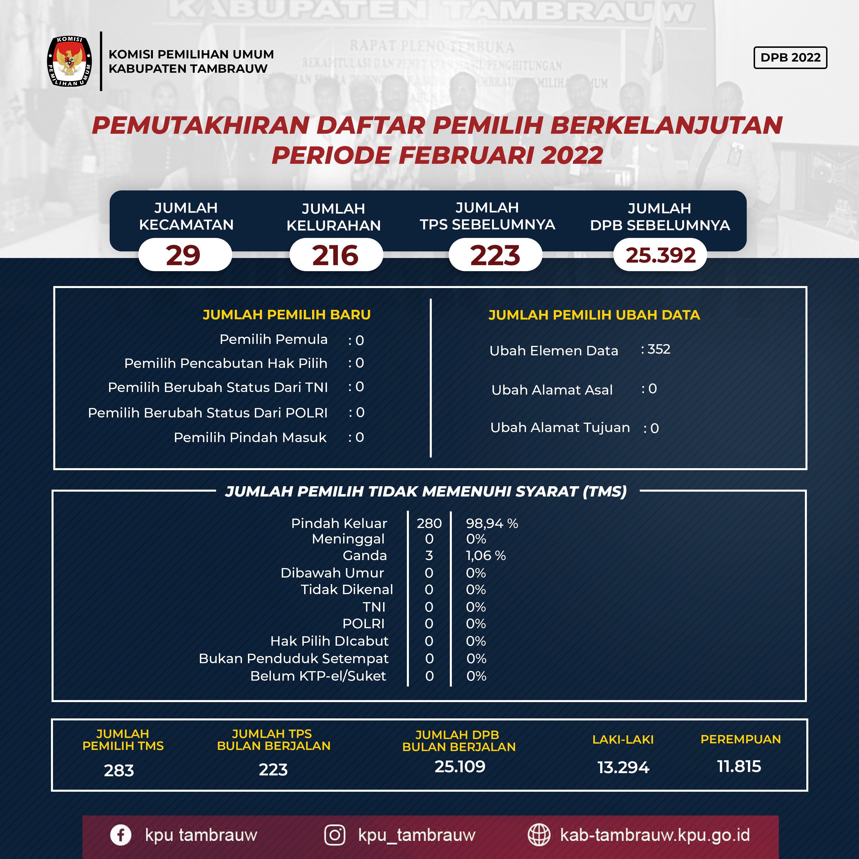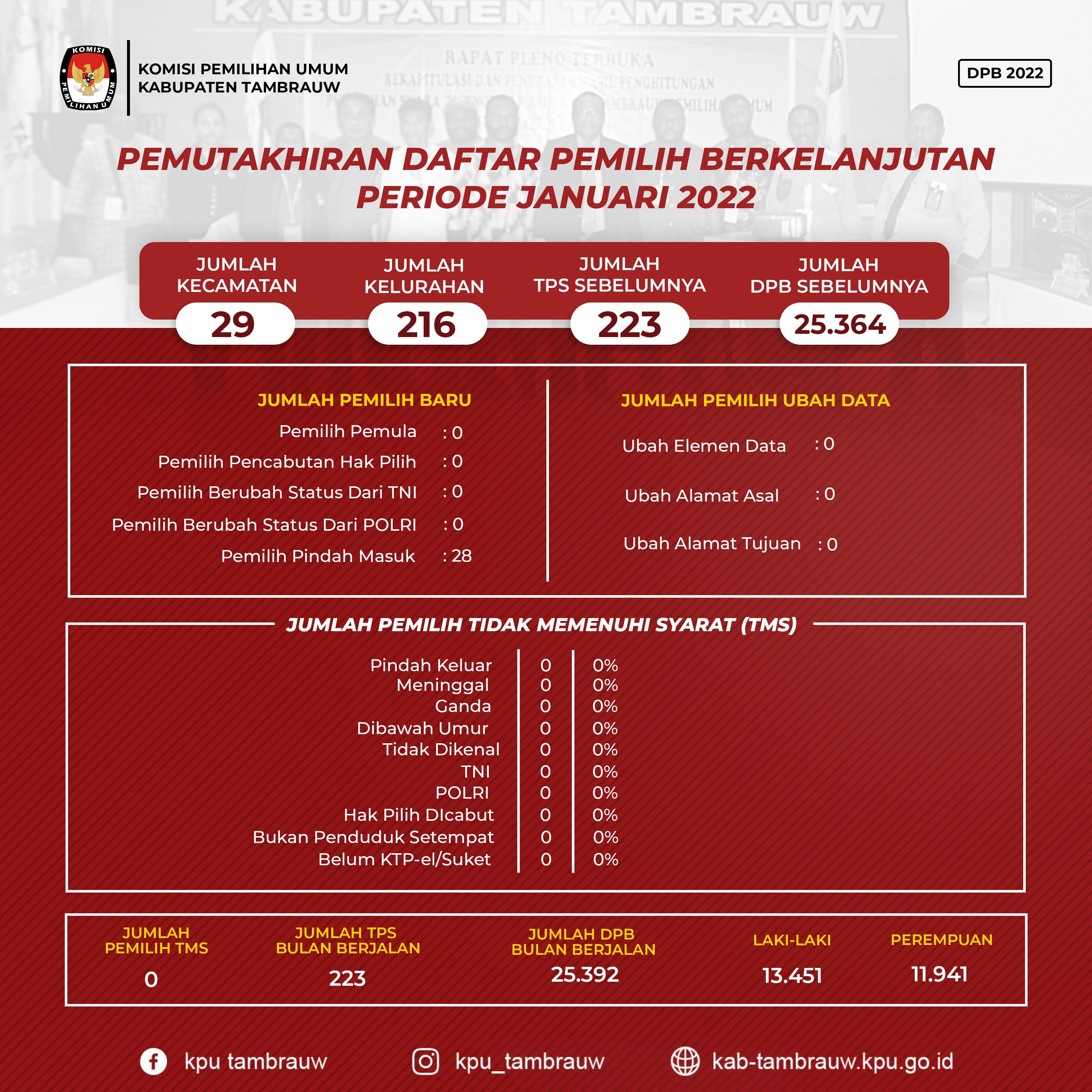 Pengumuman Rekapitulasi Daftar Pemilih Berkelanjutan Bulan Januari Tahun 2022 Jumat, 04 Februari 2022 00:00 1624 Download Berita Acara DPB bulan Januari 2022 Baca Selengkapnya
