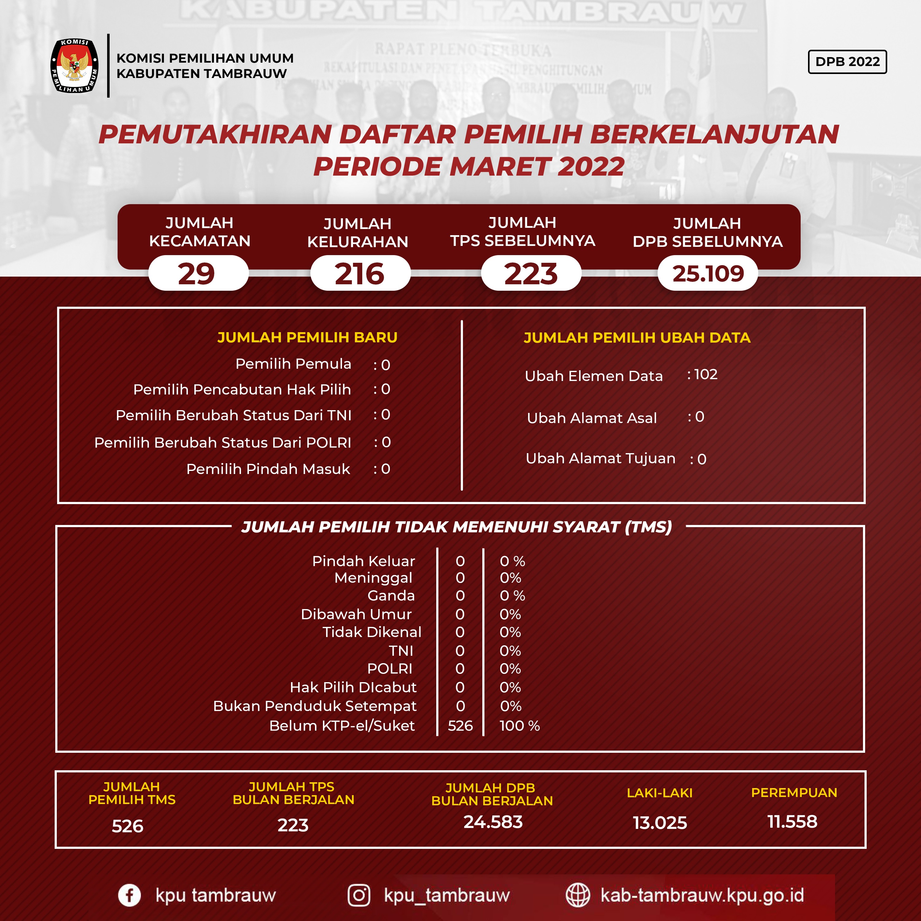Pengumuman Rekapitulasi Daftar Pemilih Berkelanjutan Bulan Maret Tahun 2022 Jumat, 01 April 2022 00:00 1622 Lindungi hakmu untuk memilih di lindungihakmu.kpu.go.id Download Berita Acara DPB bulan Maret 2022 Baca Selengkapnya