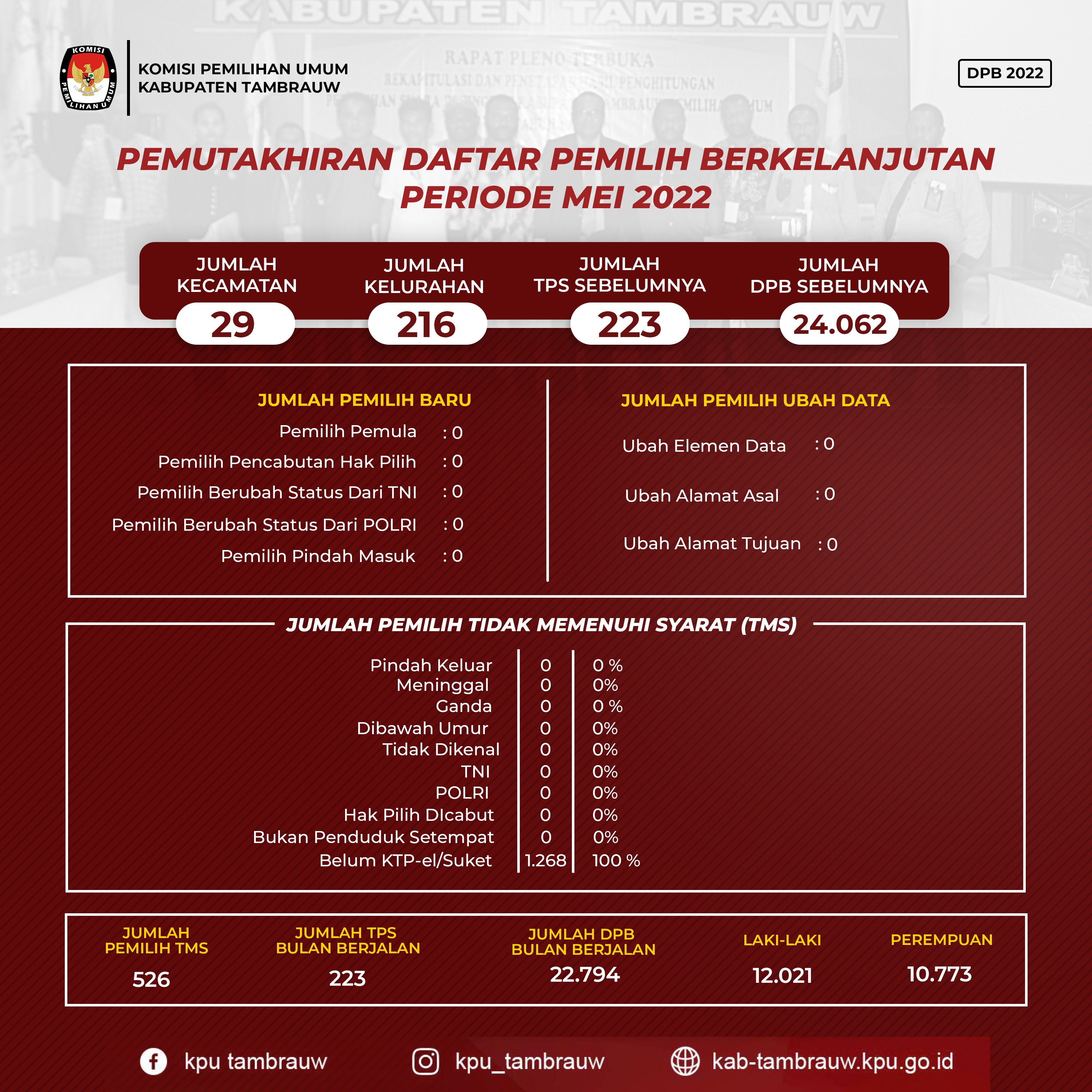Pengumuman Rekapitulasi Daftar Pemilih Berkelanjutan Bulan Mei Tahun 2022 Rabu, 01 Juni 2022 00:00 1602 Lindungi hakmu untuk memilih di lindungihakmu.kpu.go.id Download Berita Acara DPB bulan Mei 2022 Baca Selengkapnya